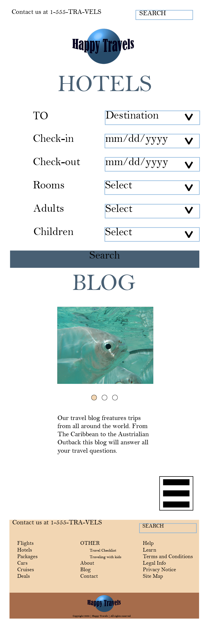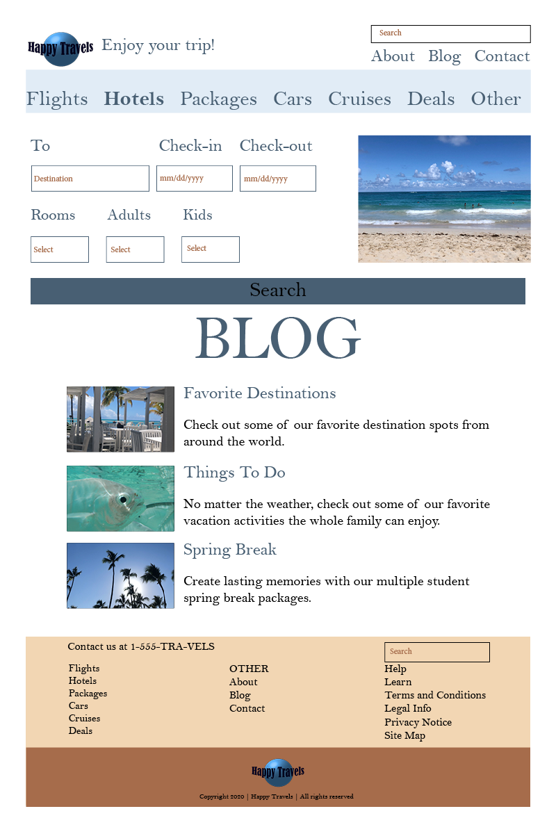 For the body, I added two essential pieces of information, the hotel finder, and the blog articles. After looking up a destination spot, it is necessary to do your homework on the location, things to do, or if there is any cultural information you need to know beforehand. So when writing the copy for the mock blog posts, I wanted to create something catchy and persuasive (Kolowich).