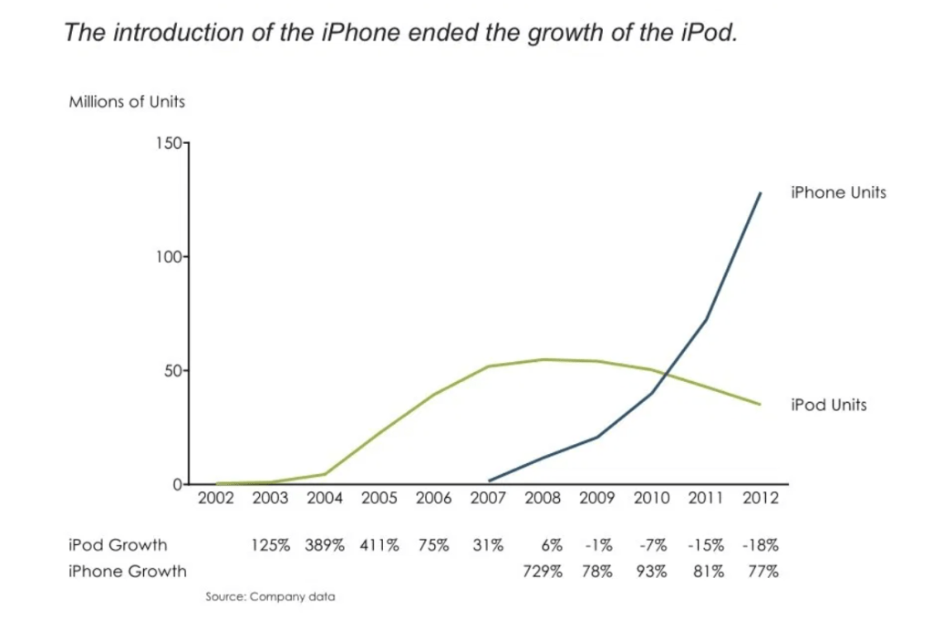This data set shows the trends of iPhones vs. iPods. It is taking millions of units and breaking them down across several years to show that Apple put one of its own product out of business.