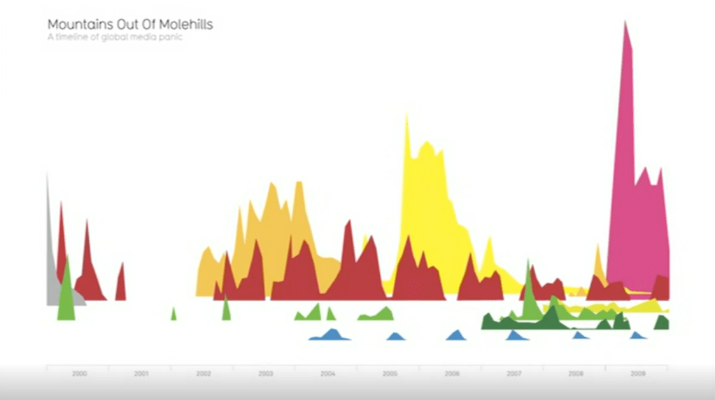 Here is a visualization taken from a TedTalk by David McCandless on media panic from 2000 to 2009. The back row shows fears of illnesses, the green signifies fears of astroid collisions, and the blue in the front is the fear of killer wasps. An interest trend to note is the red peaks that show the fear of violent video games. The trends spike in November (before the Holiday season) and April (anniversary of the Columbine shooting). McCandless discusses these trends in more detail, but this simple, data-driven graphic shows patterns in a quick and visual manner.