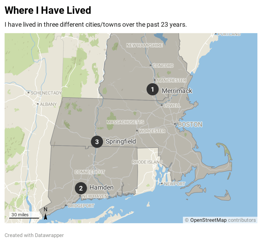 This map quickly shows the various locations that I have lived over the course of my life. To expand on this data, it would be interesting to see (not during COVID-19 quarantine) all the places that I have visited in a week, month, or year.