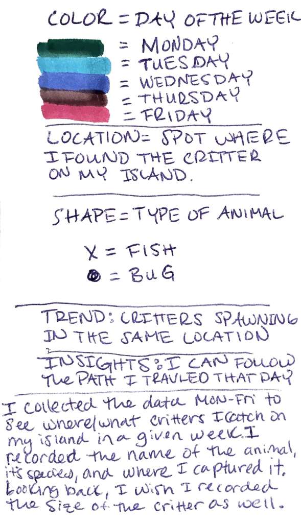 About: This visualization represents the collection of bugs and fish that I gathered over the course of five days while playing Animal Crossing: New Horizons on my Nintendo Switch Lite.