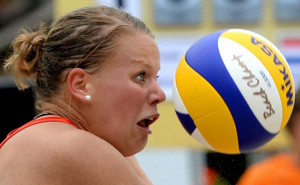 Here we see a young volleyball player about to be hit in the face by the ball. Telling where her eyes are looking, the ball is moving very fast and will probably sting for a while. Speaking from experience, she is feeling a little bit of fear, surprise, and anger. From the audience, it is very funny to watch. After making sure they are okay, its common to hear a few chuckles from the crowd.