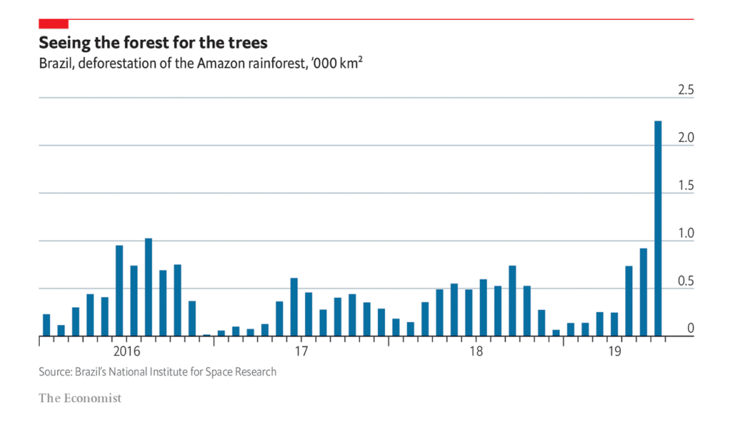 For example, the most alarming part of the chart is at the very end. There is a sharp increase in deforestation in 2019, leading the viewer to ask why there was such a vast increase. With further investigation, the viewer would find the rise in deforestation is due to Brazil’s new president.