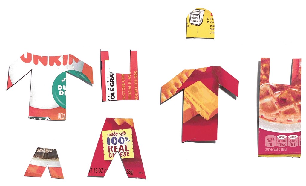 With just 10 minutes to build a prototype, I got to work cutting out different articles of clothing from cardboard boxes. I cut out shirts, pants, shorts, a dress, and a hat for Kelsey to mix and match.