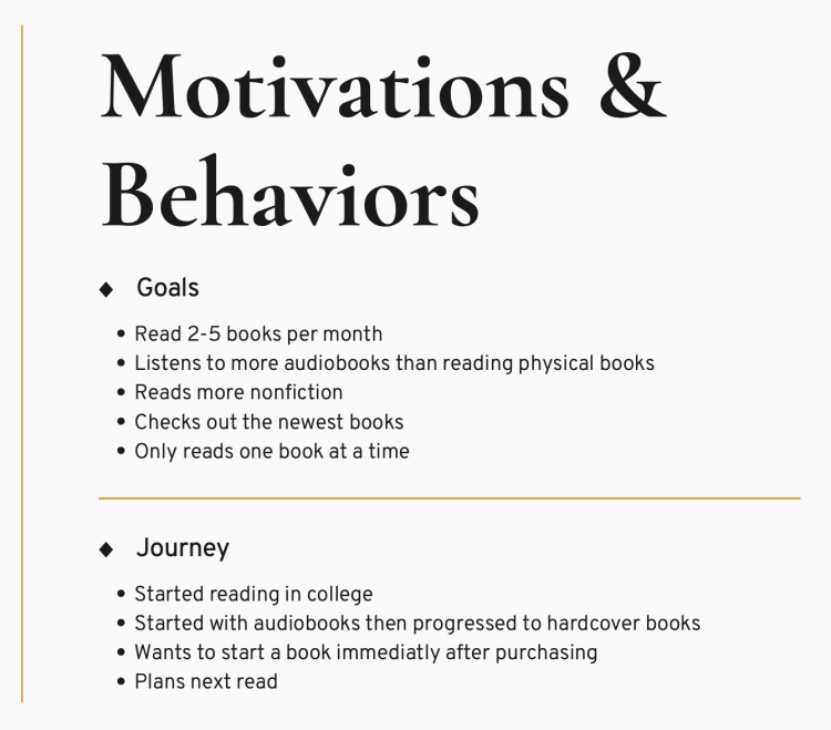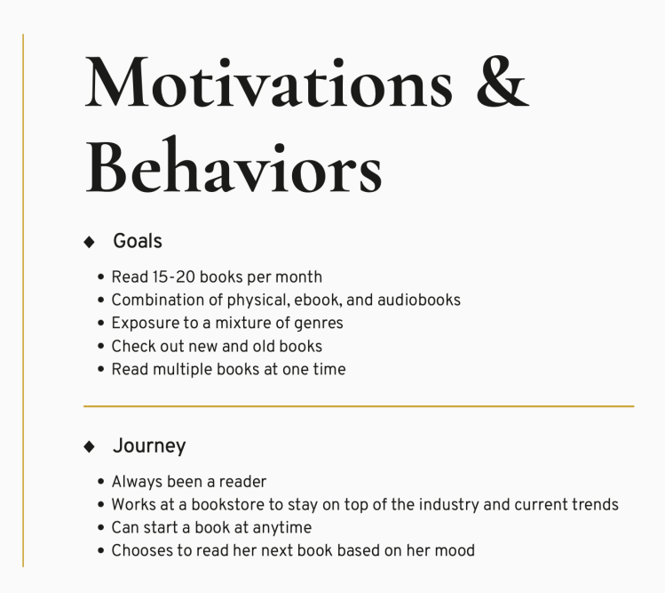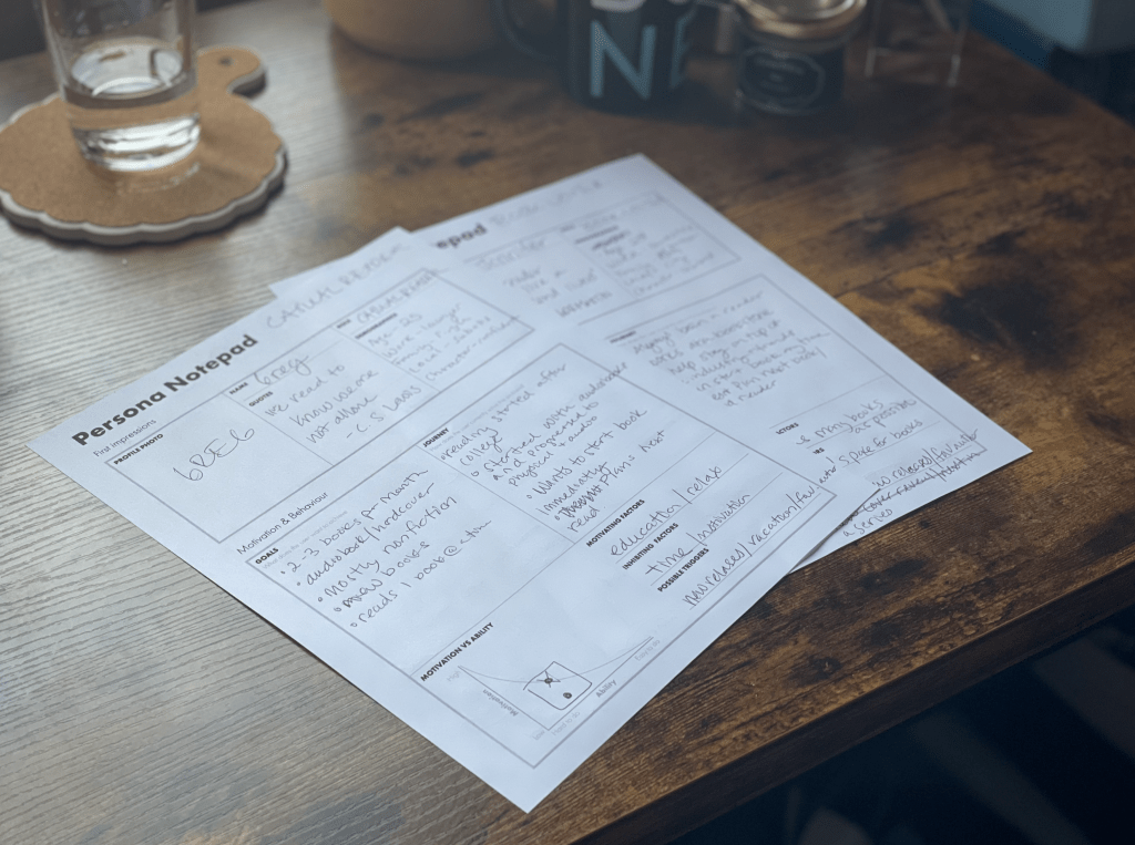 I started by printing two templates to fill out. One persona came from my own perspective, and the other one needed to come from a hypothetical user’s perspective. To get into the other user’s head, I reflected on past experiences with customers as a bookseller. It made it a lot easier to complete the template because I had already experienced some of the thoughts and opinions of new reads, casual readers, and avid readers.