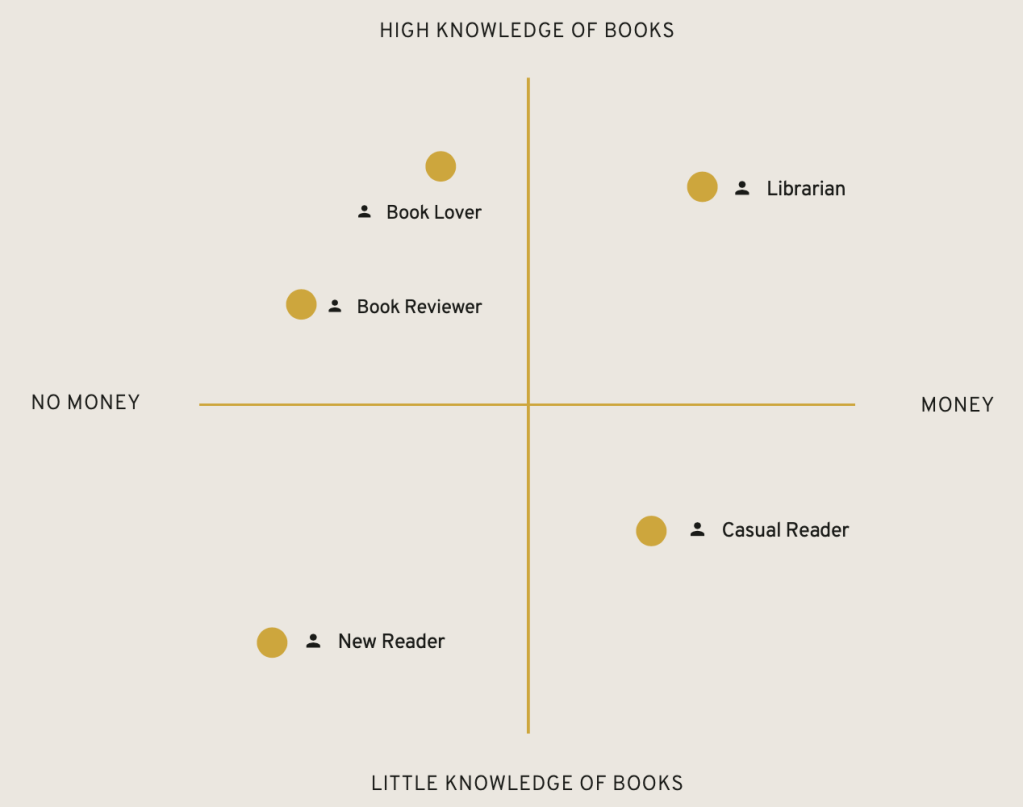 Lastly, creating related personas was fun. For Jennifer, I came up with more reader-centered personas while creating more professional personas for Greg. Next, I had to create a persona matrix to see where each persona could relate to one another. For the axis, I choose to focus on cost and literary knowledge. From there, I placed each persona in its appropriate quadrant and added “book lover” for Jennifer’s persona and “casual reader” for Greg’s persona.
