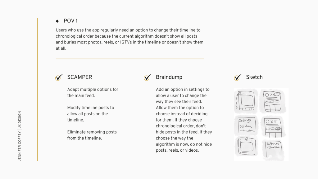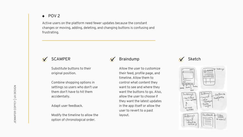 To generate new ideas, I will use each ideation method for each POV statement. A few weeks ago, I created two POV statements for Goodreads, Instagram, and Shop/ Shopify. Below is a combination of the statements, techniques, and solutions.